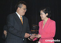 美東時間八月十二日,由美國聯(lián)邦政府舉辦的紐約區(qū)二○○四年少數(shù)族裔企業(yè)發(fā)展周活動在紐約開幕。美國商務部少數(shù)族裔商業(yè)發(fā)展署副署長董繼玲(右)向《星島日報》紐約公司執(zhí)行總監(jiān)梅建國(左)頒發(fā)獎杯,表彰《星島日報》成為本年度美國少數(shù)族裔的最佳企業(yè)。作者:陳建