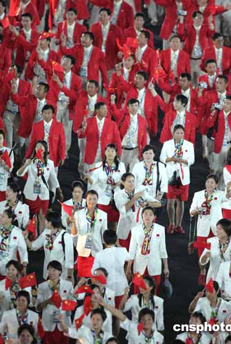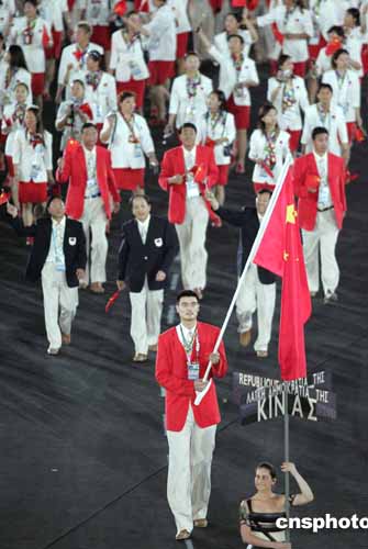 當(dāng)?shù)貢r(shí)間八月十三日晚,第二十八屆奧運(yùn)會(huì)在希臘雅典開幕。圖為中國(guó)體育代表團(tuán)以龐大陣容進(jìn)入會(huì)場(chǎng)。中新社記者:毛建軍