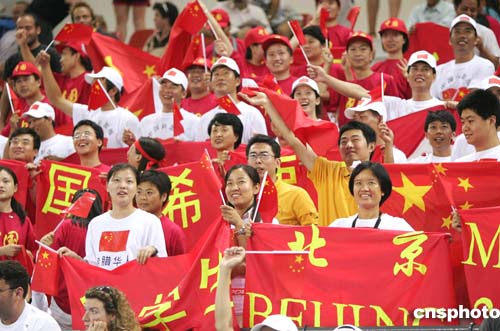 當(dāng)?shù)貢r(shí)間八月十四日,第二十八屆奧運(yùn)會女籃比賽拉開戰(zhàn)幕,中國女籃在雅典赫利尼科籃球館首戰(zhàn)韓國以七十一比五十四獲得勝利。圖為中國啦啦隊(duì)在賽場為女籃姑娘們吶喊助威。中新社記者:毛建軍
