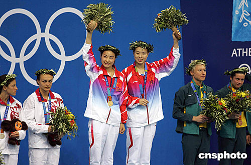 關于獲得金牌后的感受。第一次獲得奧運金牌的郭晶晶神色平靜:“挺高興的!钡诙握驹趭W運領獎臺最高處的田亮卻充滿激情:“我真的很激動。在上屆奧運會上我丟掉了這枚金牌,這次我終于‘找’回來了!