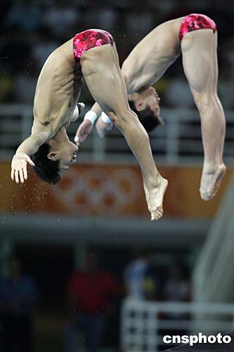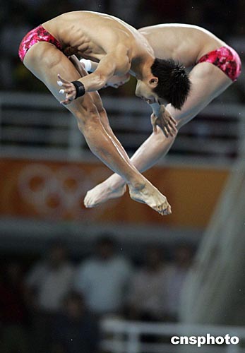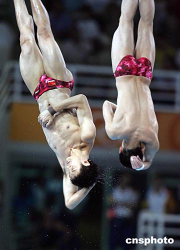 當?shù)貢r間八月十四日晚,中國跳水隊田亮、楊景輝在雅典奧運跳水館獲得男子雙人十米跳臺金牌。中新社記者:毛建軍