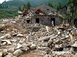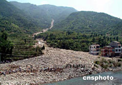 被山群圍繞的災害現(xiàn)場,七八百米長的坡型谷地堆積了數(shù)萬方從山上瀉下的石塊,大的有數(shù)噸重,泥石流所到之處的民房只剩兩間孤立在坡地西側,但一樓的墻體已被泥石流擊毀;東面谷地邊的小學教學樓一樓的兩間教室被泥石流擊穿,里面堆滿了石塊和泥土;谷地正面靠河邊的中學樓房也多處受損。依著村民手指的方向可以清楚地看到,在谷地里面一座高聳的大山上,有一道長長的新裸露的溝壑,村主任潘行岳說:“泥石流就是從那兒下來的!