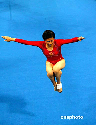 中國女子體操隊主力張楠在15日舉行的的雅典奧運(yùn)會女子體操團(tuán)體賽預(yù)賽中。中新社記者:王瑤