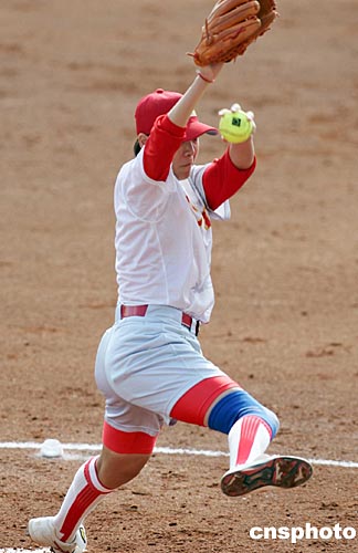 當(dāng)?shù)貢r(shí)間八月十六日,在雅典奧運(yùn)女子壘球比賽中,中國隊(duì)四比二戰(zhàn)勝加拿大隊(duì)。中新社記者:毛建軍