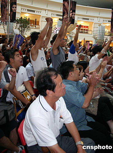 當(dāng)十八時(shí)許中國臺(tái)北隊(duì)以三比零鎖定勝利時(shí),球迷的情緒達(dá)到高潮。歡呼聲、笑聲響成一片。一些人許久不愿離去。