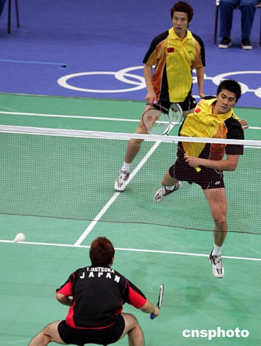 當(dāng)?shù)貢r(shí)間八月十六日,參加雅典奧運(yùn)會(huì)男子羽毛球雙打比賽的中國(guó)選手蔡赟、付海峰,以2:1戰(zhàn)勝日本選手,與另一對(duì)中國(guó)選手?jǐn)y手進(jìn)入前八名。中新社記者:任晨鳴