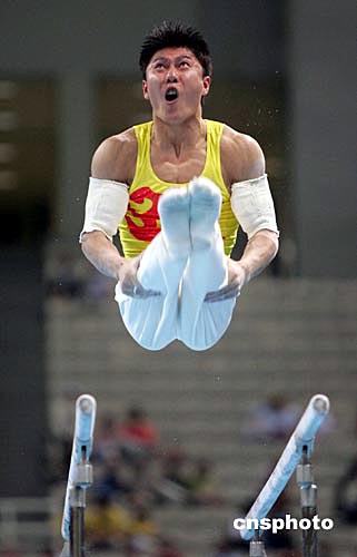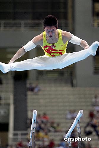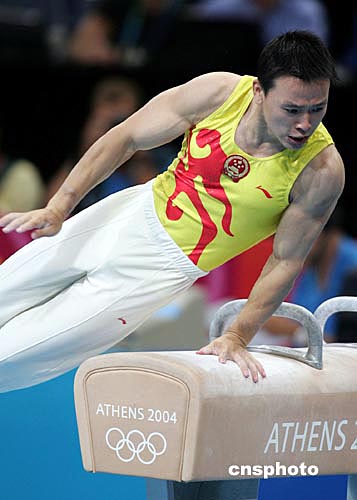 當?shù)貢r間八月十六日晚,雅典奧運男子體操團體比賽在奧運體操比賽館舉行,中國隊衛(wèi)冕失利,僅獲得第五名。中新社記者:毛建軍