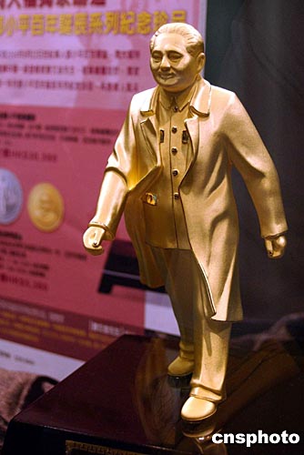 為紀念鄧小平一百周年誕辰,香港周大福金店向市面推出“鄧小平百年誕辰系列紀念珍品”,純金塑像及紀念金銀幣引人注目。作者:洪少葵
