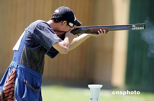 當(dāng)?shù)貢r間八月十七日,中國選手王正在雅典奧運男子雙向飛碟射擊比賽中獲得銅牌。中新社記者:毛建軍