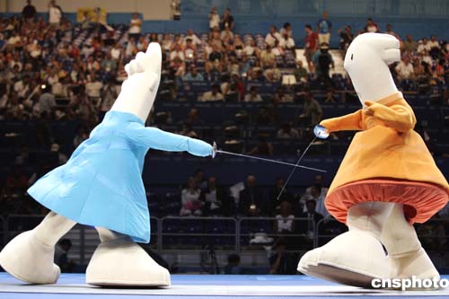 8月17日在雅典奧運(yùn)會擊劍比賽前,可愛的奧運(yùn)吉祥物為觀眾上演了一場劍法“秀”。
