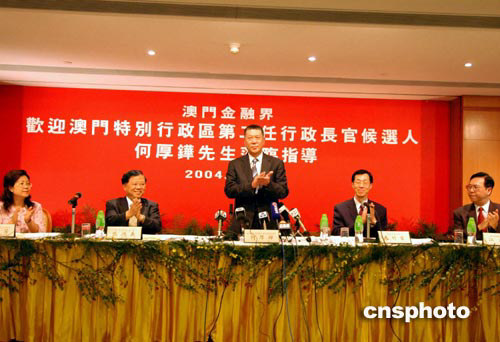 十八日,澳門(mén)特別行政區(qū)第二任行政長(zhǎng)官候選人何厚鏵在中銀大廈與澳門(mén)銀行公會(huì)、澳門(mén)保險(xiǎn)公會(huì)等金融界代表會(huì)晤,聽(tīng)取他們對(duì)未來(lái)五年澳門(mén)金融業(yè)發(fā)展的意見(jiàn)。中新社記者:梁永強(qiáng)