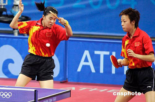 當(dāng)?shù)貢r間八月十八日,在雅典奧運會乒乓球女雙1/4決賽中,王楠、張怡寧以4:2淘汰中國香港選手桑亞蟬、帖亞娜,率先晉級半決賽。中新社記者:張煒