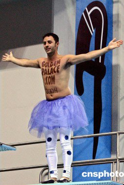 一名男子居然在無人看管下站到了正在雅典舉行的奧運會3米跳板上,他胸前寫著""是一個賭博網站的名子。
