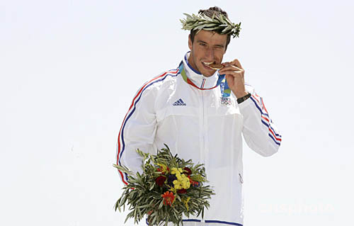 法國選手托尼·埃斯坦蓋在當?shù)貢r間8月18日的賽事比賽中奪得單人劃艇障礙回轉決賽冠軍后登臺領獎的畫面。