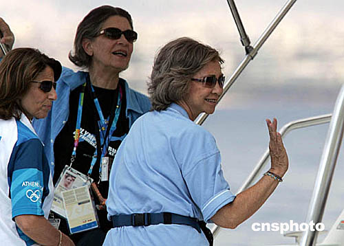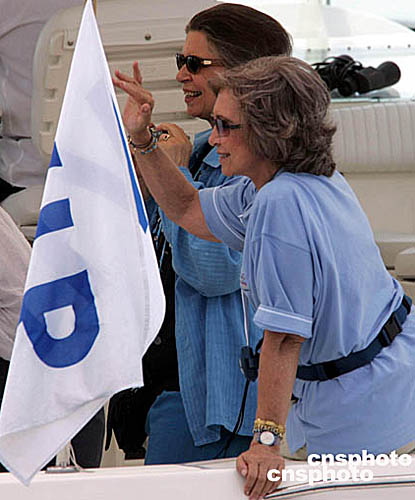 在當(dāng)?shù)貢r間8月17日舉行的女子470級的帆船帆板比賽中,西班牙皇后索菲婭親臨現(xiàn)場,為運動員打氣。