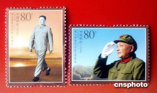 為紀(jì)念鄧小平誕辰100周年,中國(guó)國(guó)家郵政局將于2004年8月22日發(fā)行《鄧小平同志誕生一百周年》紀(jì)念郵票1套2枚,小型張1枚。兩枚郵票的名稱分別為:中共中央總書記(左)、中共中央軍委主席(右),面值均為人民幣80分。小型張圖案名稱為:改革開放和現(xiàn)代化建設(shè)總設(shè)計(jì)師,面值人民幣6元。中新社記者:鄒憲