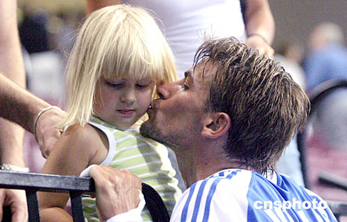 圖為在當(dāng)?shù)貢r(shí)間8月18日舉行的男子手球比賽中,希臘選手Vago VOGLIS給場邊一小球迷深情一吻。