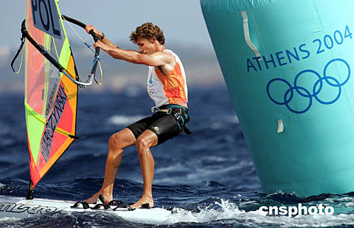 圖為波蘭選手Przemyslaw Miarczynski在當(dāng)?shù)貢r(shí)間8月18日舉行的男子帆船帆板比賽中的一個(gè)鏡頭。