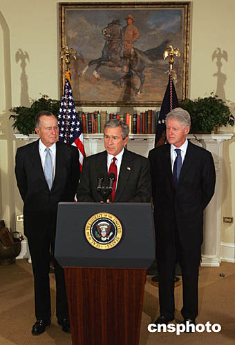 美國(guó)總統(tǒng)布什當(dāng)?shù)貢r(shí)間一月三日在白宮發(fā)表講話,請(qǐng)出其老父親、前總統(tǒng)布什和其前任克林頓,領(lǐng)導(dǎo)美國(guó)私人賑災(zāi)行動(dòng),呼吁為印度洋地震海嘯受災(zāi)國(guó)捐款。當(dāng)天布什還與夫人勞拉到印尼、斯里蘭卡、泰國(guó)、印度四國(guó)駐美使館哀悼遇難者。作者:美芬
