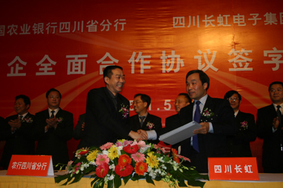 中新四川網(wǎng)1月5日電(記者肖龍聯(lián))中國農(nóng)業(yè)銀行四川省分行與四川長虹電子集團(tuán)有限公司今天上午在成都錦江賓館舉行銀企全面合作簽約儀式,農(nóng)行將為長虹提供綜合授信三十億元人民幣,以幫助長虹克服反傾銷帶來的不利影響,支持長虹集團(tuán)新一屆領(lǐng)導(dǎo)人確立的多元化、國際化發(fā)展戰(zhàn)略的實(shí)施。