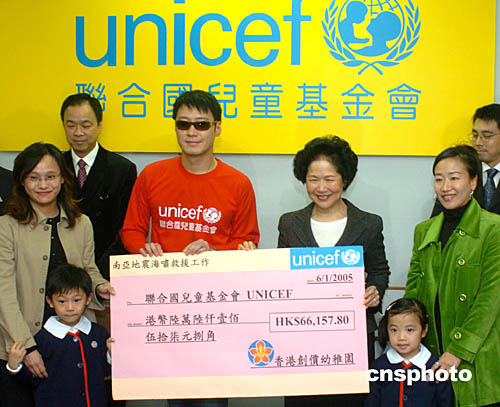 為南亞地震海嘯賑災籌款,聯(lián)合國兒童基金會香港委員會副主席陳方安生太平紳士﹑親善大使黎明6日在本部收到香港數家企業(yè)的捐款,兒童也到場參與捐款活動,到目前為止已籌得超過4800萬港元。