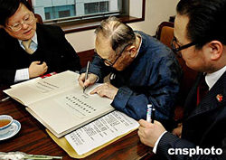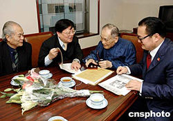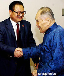 “2004年度中國最具影響力行業(yè)十佳品牌、行業(yè)十佳企業(yè)家”全球發(fā)布會將與本月20日在香港隆重舉行,大會主席周茳釤鈞, 7日下午,與本屆大會榮譽主席、香港南洋商業(yè)銀行名譽董事長莊世平先生,交換大會相關事宜的建議。中新社記者:宋吉河