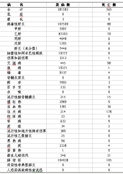 2004年12月,報告發(fā)病數(shù)居前五位的病種為:肺結核、乙型肝炎、細菌性和阿米巴性痢疾、淋病、梅毒,占發(fā)病總數(shù)的85.17%。