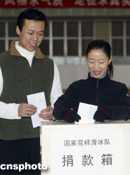 一月十日日,中國國家花樣滑冰隊在北京首都體育館花樣滑冰訓練場舉行向東南亞海嘯災民捐款活動。中國花樣滑冰名將申雪、趙宏博當場捐獻出一個月工資。作者:盛佳鵬