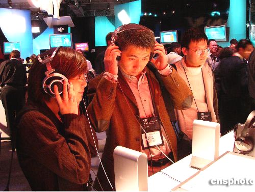 一月六日在美國拉斯維加斯開幕的二00五國際消費(fèi)電子展,吸引世界各地的商家及消費(fèi)者。圖為來自中國大陸的參觀者在索尼展臺(tái)前試聽音響。作者:潘旭臨