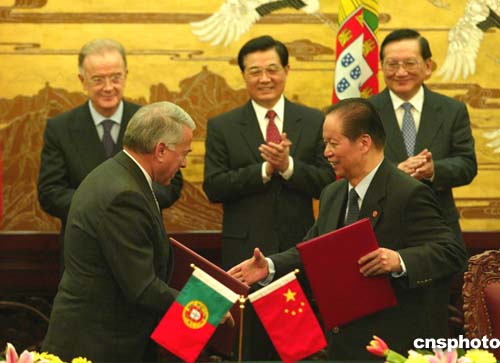 兩國元首在會談后還出席了《中葡關(guān)于經(jīng)濟(jì)合作協(xié)議》等雙邊合作文件的簽字儀式。