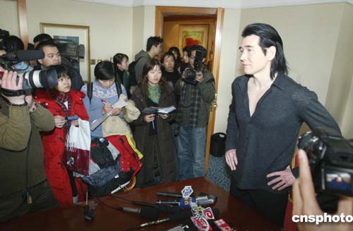 今次專程從臺灣趕來北京的費翔一襲黑衣黑褲,露到胸口的領口不失性感。在發(fā)布會上他一再表示,今日只談被誤解的“胸毛賑災”一事,其余話題一概不回答。而記者看到,在發(fā)布會全程不管問他新專輯還是將來的工作計劃,他都婉轉地予以回絕。