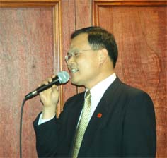 晚宴的主角、新到任的副總領事曠偉霖隨后來到臺前,向主辦宴會的僑團表示感謝。他表示,在他到任剛剛四十幾個小時就收到了宴請的通知,令他十分感動,僑胞的熱情令他感受到很大的鼓勵和支持。