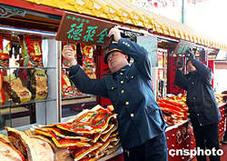 春節(jié)將至,北京東城工商分局加強(qiáng)對(duì)食品進(jìn)行安全檢查。在檢查中一超市在北京特產(chǎn)“全聚德”烤鴨招牌下出售非“全聚德”烤鴨并懸掛“全聚德”招牌,對(duì)消費(fèi)者造成誤導(dǎo),工商執(zhí)法人員將其招牌摘下。作者:羅偉