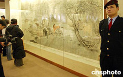 近日,重張開業(yè)的北京懋隆藝術(shù)館,展示館藏精品《柳林十駿圖》,該圖長523cm,寬256cm設(shè)色絹本,由張善仔、張大千合作而成,是迄今張氏兄弟合作繪制的最大畫作,極具鑒賞與收藏價值。中新社記者:錢興強