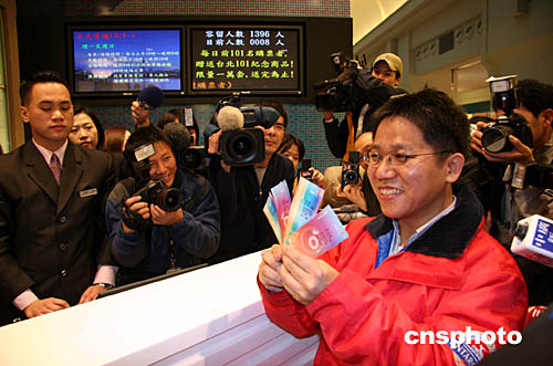 正式售票的半小時前,臺北一O一大樓觀景臺在五樓舉辦了“祥獅獻瑞”慶;顒,兩頭生動活潑的紅色醒獅為排隊等候買票的觀眾和媒體作了精彩表演,觀景臺經(jīng)理季正杰隨后為售票開鑼。(完)