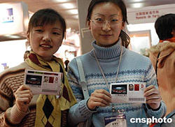 | 兩名北京女青年一月二十日上午來(lái)到北京國(guó)貿(mào)中心展館,在“第三屆北京國(guó)際體育基礎(chǔ)設(shè)施和場(chǎng)館技術(shù)展覽會(huì)”金牛直通自助售票機(jī)前,各自模擬定購(gòu)了附有自己快照的2008年(8月8日20:00時(shí))北京奧運(yùn)會(huì)開(kāi)幕式----國(guó)家體育館漂亮的觀眾票,模擬票價(jià)在千元以上不等。此次展會(huì)匯聚了國(guó)內(nèi)外眾多著名電子服務(wù)和場(chǎng)館技術(shù)企業(yè)。中新社記者:鄒憲