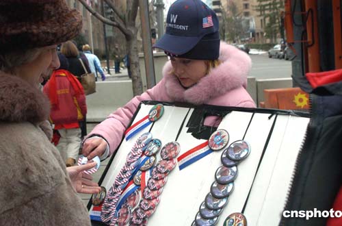 當(dāng)?shù)貢r間1月20日,在布什就職典禮會場外,小商販兜售帶有布什頭像的紀(jì)念章,頗為搶手。作者:余東暉