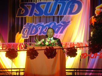 張大使在致辭中表示,泰國政府和人民面對突如其來的海嘯災(zāi)難,反應(yīng)迅速,措施有力,在很短的時間內(nèi)取得了階段性成果。中國政府和人民對泰國遭災(zāi)十分關(guān)注。胡錦濤主席和溫家寶總理致電慰問,中國政府派出醫(yī)療隊和DNA專家組協(xié)助救災(zāi)。中國國內(nèi)各界群眾、海外華人華僑、中資機構(gòu)和留學(xué)生掀起了一波波捐款熱潮。“一方有難,八方支援”,這一中華民族的優(yōu)良傳統(tǒng)發(fā)揚光大到了一個新的高度。