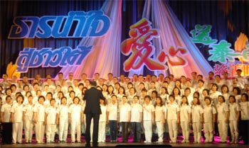 晚會在對泰國海嘯遇難者的默哀中拉開帷幕。中國大使館、中華總商會等多個合唱團,圍繞著愛心這一主題,表演了許多感人的曲目。