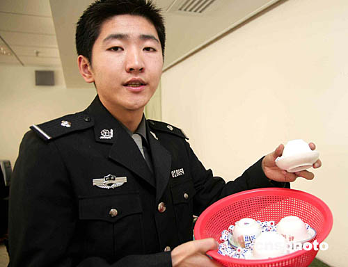 北京警方公布:自去年十二月上旬正式部署查禁賭博專項行動以來,共破獲網(wǎng)絡(luò)賭博案件八起,抓獲涉案人員三十六人;還打掉“百家樂”、“六合彩”、“皇帝公司賭”、“扎金花”等傳統(tǒng)聚眾賭博窩點五十七個,抓獲賭博人員六千五百三十九人,收繳賭博資金三百八十六萬余元人民幣。圖為警員展示部分賭具。作者:劉永生