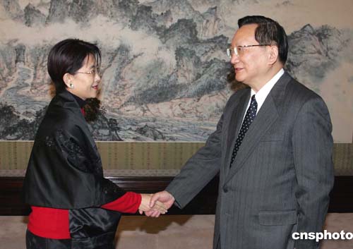 一月二十四日上午,國務(wù)委員唐家璇在北京中南海會(huì)見洪秀柱、穆閩珠等臺(tái)灣海峽兩岸聯(lián)合經(jīng)貿(mào)協(xié)會(huì)參訪團(tuán)成員。作者:毛建軍