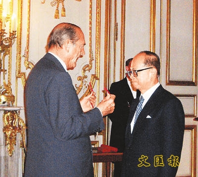 中新網(wǎng)1月25日電 據(jù)香港文匯報(bào)報(bào)道,法國(guó)政府早前向香港富商、長(zhǎng)和系主席李嘉誠(chéng)頒授榮譽(yù)軍團(tuán)司令勛章(Commandeur de la Legion d,honneur)。授勛儀式在上周四晚在巴黎總統(tǒng)府愛(ài)麗舍宮舉行,由法國(guó)總統(tǒng)希拉克親自主持。