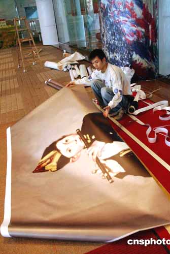 “法國印象派繪畫珍品展”將在2月5日在香港藝術(shù)館揭幕,即將亮相的47幅法國印象派名作已運(yùn)抵香港藝術(shù)館布展,1月27日,工作人員張貼名畫海報(bào)《吹笛子的男孩》。作者:洪少葵