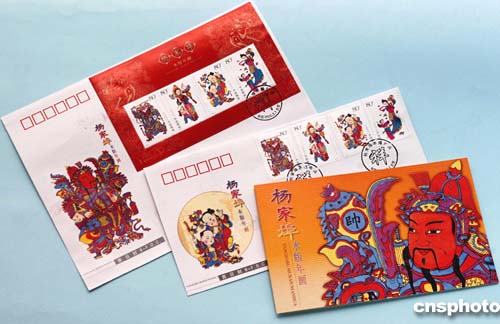 | 北京市郵票公司為配合國家郵政局于2005年2月1日發(fā)行《楊家埠木版年畫》特種郵票(1套4枚),特設(shè)計印制了該郵票的首日封(中)、小全張首日封(左)、郵折(右)等郵品,并將與郵票同日發(fā)行!稐罴也耗景婺戤嫛诽胤N郵票名稱分別為“門神”、“連年有余”、“喜報三元”、“天女散花”,面值均為80分,小全張售價4.80元。“楊家埠木版年畫”在明代時起源于山東濰坊市濰縣楊家埠,盛于清代,流傳至今,堪稱為民間美術(shù)珍品。作者:鄒憲
