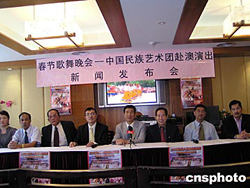 | 以西藏藝術(shù)家為主的中國民族藝術(shù)團(tuán),將于2005年春節(jié)期間赴澳大利亞巡回演出,為當(dāng)?shù)厝A人華僑歡度春節(jié)增添喜慶氣氛。澳中文化科技促進(jìn)會(huì)會(huì)長馮敦平博士(左4)當(dāng)?shù)貢r(shí)間1月27日在悉尼華埠舉行的新聞發(fā)布會(huì)上說,中國民族藝術(shù)團(tuán)赴澳巡演首場于2月11日(大年初三)在悉尼市政廳舉行。中國駐悉尼總領(lǐng)事館文化領(lǐng)事尹亞利(右4)說,這一被中國文化部譽(yù)為“國家杰出文化團(tuán)體”,此后將赴堪培拉參加澳大利亞多元文化藝術(shù)節(jié),并到阿德萊德、墨爾本、黃金海岸和布里斯班等地巡演。作者:劉雨生