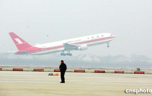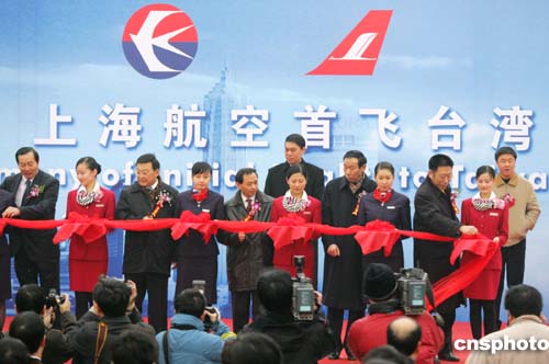 一月二十九日上午八點(diǎn),上海航空首飛臺(tái)灣歡送儀式在浦東國際機(jī)場(chǎng)舉行,上海各界人士在停機(jī)坪為返鄉(xiāng)過年的二百多名臺(tái)商送行。作者:湯彥俊