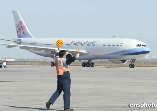 臺灣中華航空公司的民航班機一月二十九日十一時五十八分飛抵北京首都國際機場,這是五十六年來臺灣民航航班首度飛抵北京。作者:滿會喬