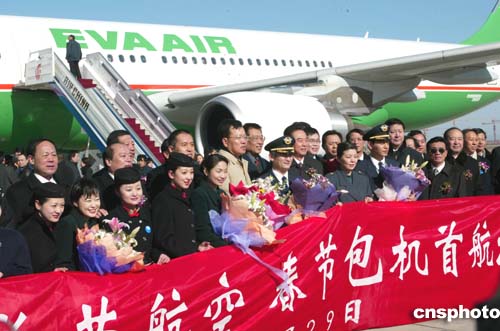 魏幸雄領(lǐng)銜的華航是次由臺(tái)北載來了兩百五十名臺(tái)商及其眷屬,上座率約為七成。十二時(shí)二十二分,臺(tái)灣長榮航空的飛機(jī)也平穩(wěn)地降落在首都機(jī)場,載來了兩百一十名思鄉(xiāng)心切的臺(tái)灣同胞。