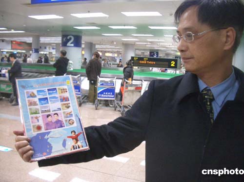 | 二00五年臺(tái)商春節(jié)包機(jī)二十九日首次實(shí)現(xiàn)兩岸雙向?qū)︼w,臺(tái)灣首班飛抵北京的華航CI581班機(jī)于十一點(diǎn)五十八分到達(dá)北京首都機(jī)場(chǎng),華航為此特發(fā)行紀(jì)念郵票一套,并在飛機(jī)上贈(zèng)送給旅客。作者:路梅