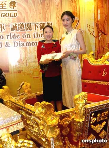 金至尊主席伍綺媚(左)29日在九龍尖沙咀彌敦道上一家分店開業(yè)儀式上向歌星(金至尊代言人)陳慧琳贈送禮品。作者:趙振清